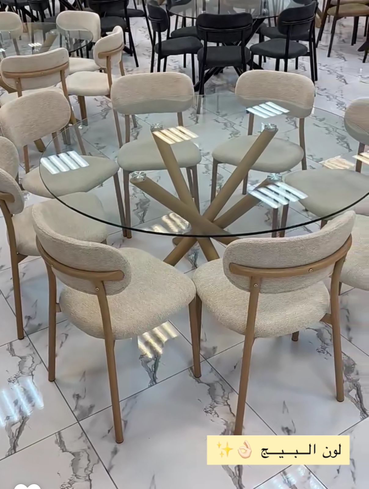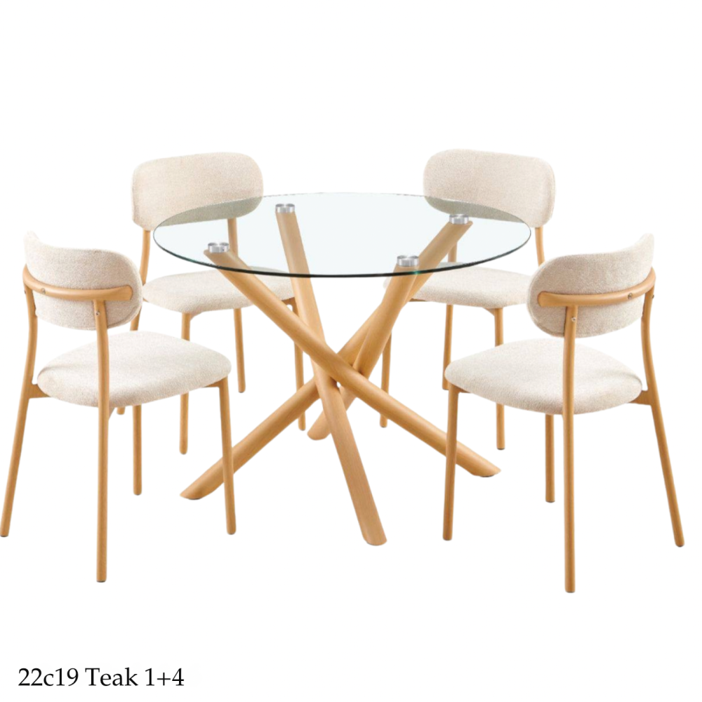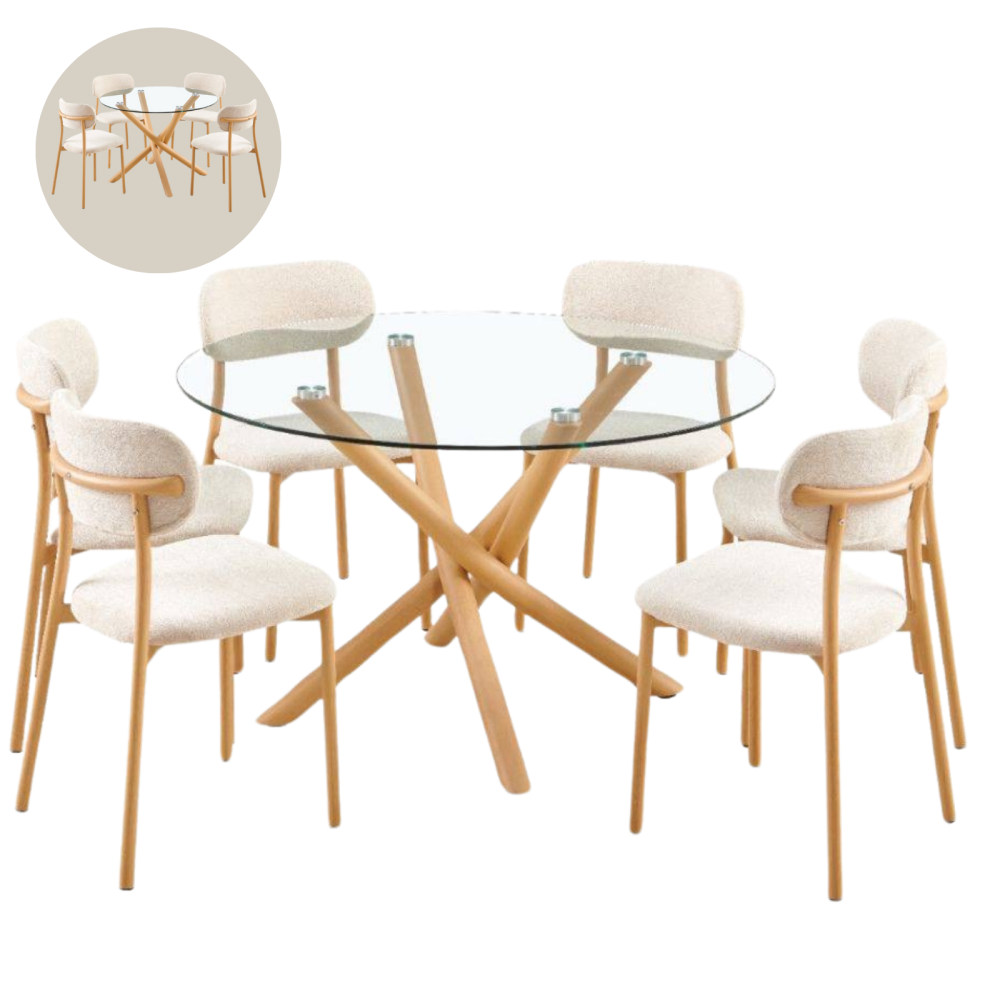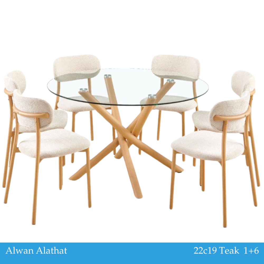 To enjoy meals with family and friends, order this dining table set, which is distinguished by its modern design that adds a touch of modernity to the dining room decor. It consists of a table with a circular surface made of clear glass and equipped with slanted legs that add a touch of fluidity and distinction to the design, in addition to a set of chairs made of the finest soft and comfortable materials.