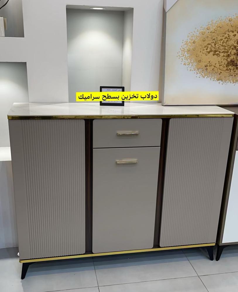 A shoe cabinet designed in gray, black and white with gold details. These colors form a lovely color harmony that draws attention to the elegance of the cabinet design. This cabinet is made of durable treated materials and is equipped with metal legs that are distinguished by their ability to withstand heavy weights. You can choose it to use it in the entrance of the house as an entrance cabinet or in the bedroom.