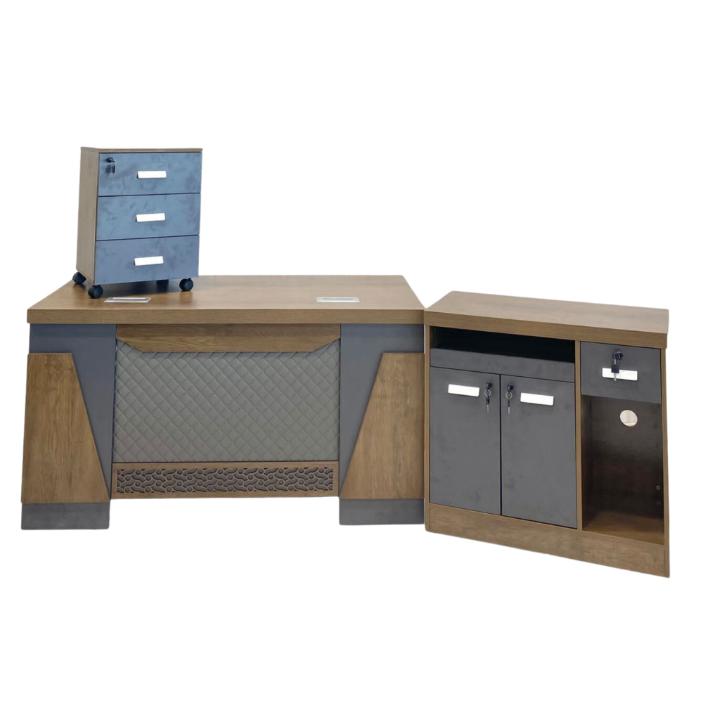A large office desk with a luxurious design consisting of a work table decorated with a contrasting coloured engraved design on the front side that adds luxury to the surrounding decor, a side secretariat suitable for the computer, in addition to a cabinet consisting of three lockable drawers for placing important documents and work papers.