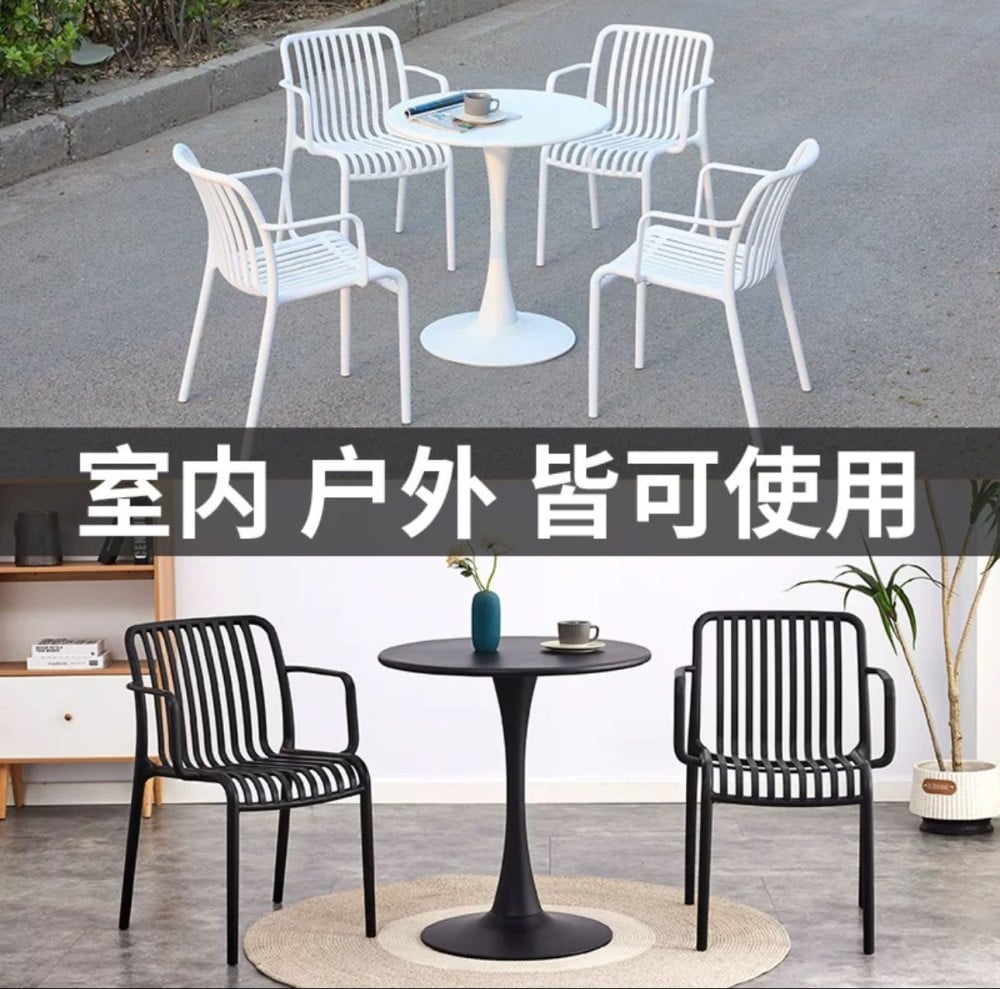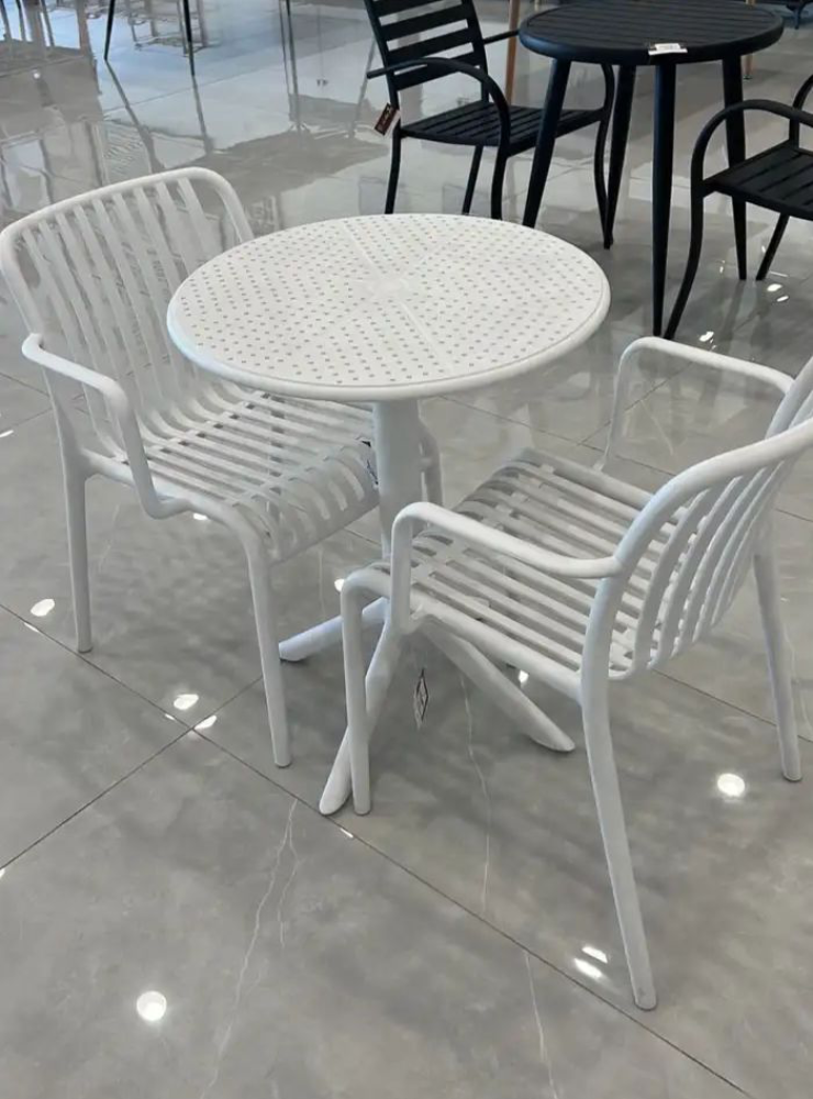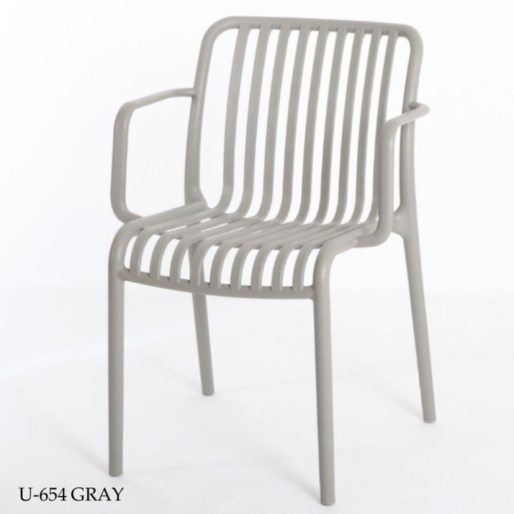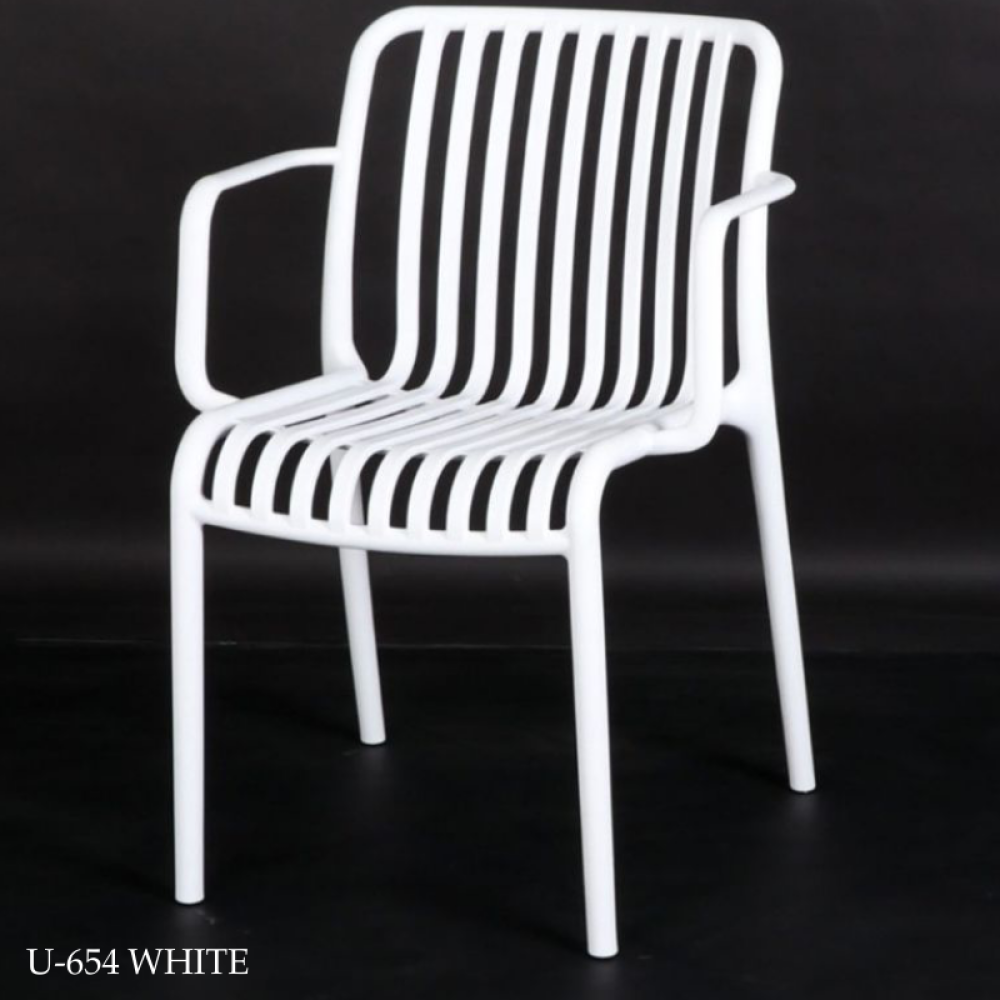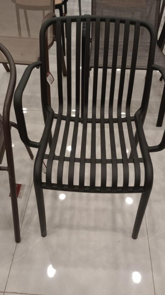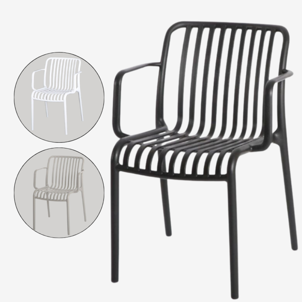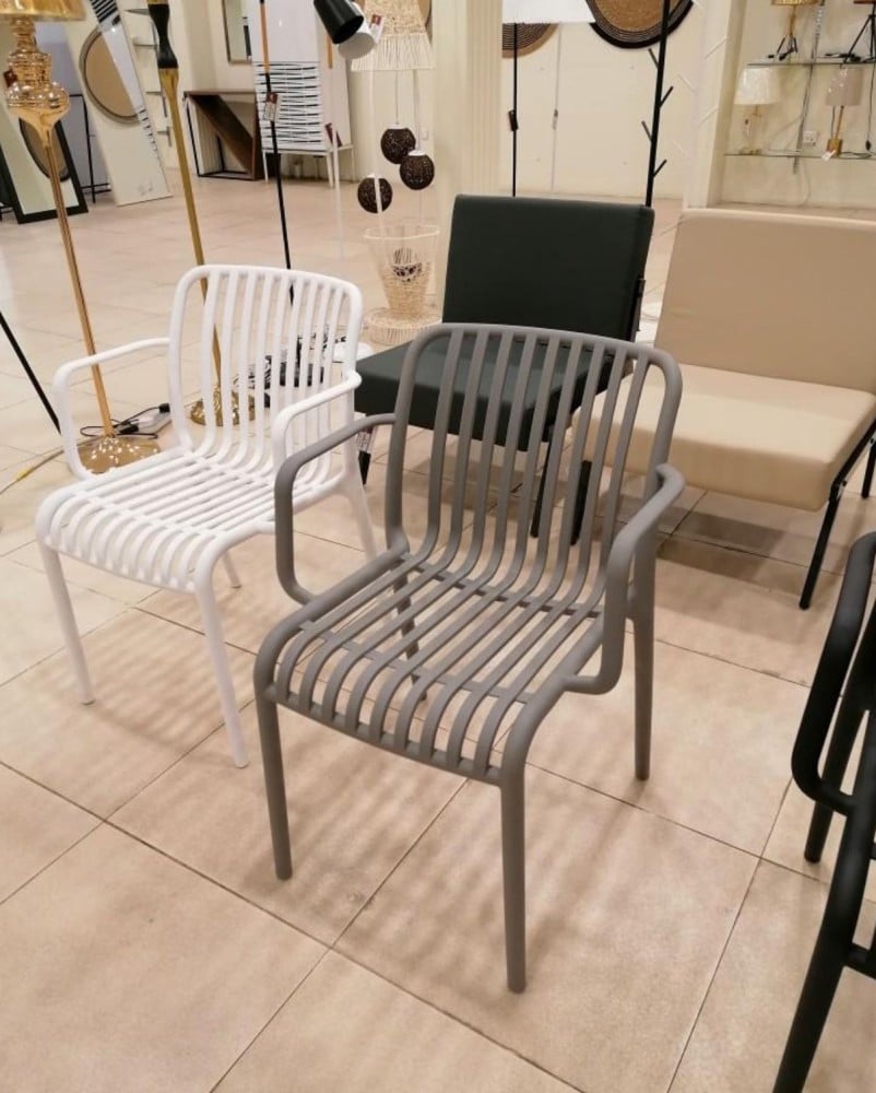 A set of four chairs, offered to you at an exclusive wholesale price. The chairs are made of fiber that is resistant to heat, water and all weather conditions, with a design equipped with a seat and backrest in the form of bars and equipped with armrests to provide comfort while sitting.