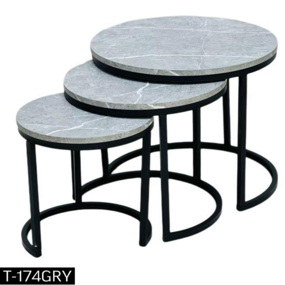 A set of three coffee and service tables with a circular top and a camouflaged design that adds a touch of luxury to the decor. The tables are equipped with a semicircular metal base so that you can place the set in succession so that it does not take up a lot of space.