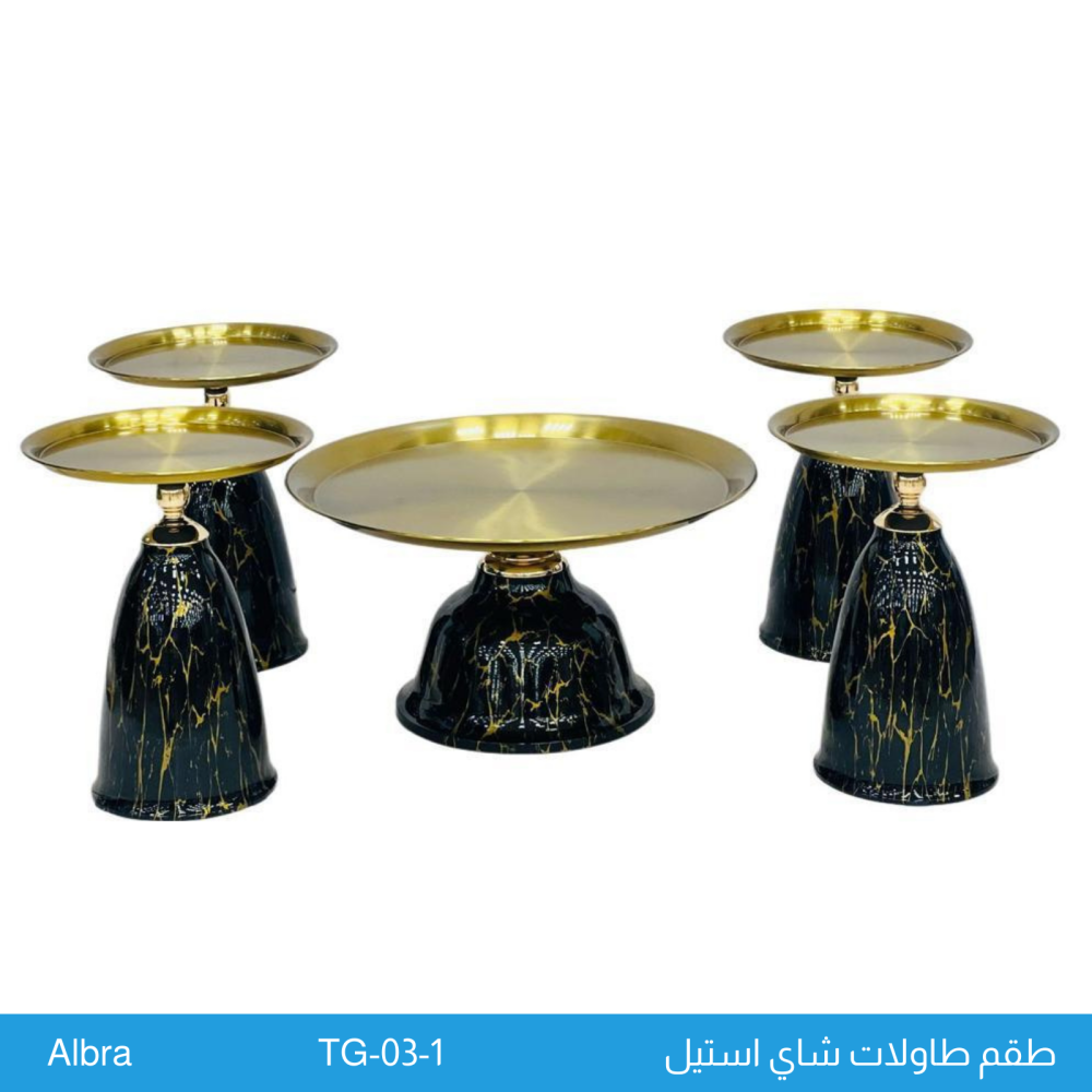 Elegance and luxury are represented in this table set consisting of four small tables and a large table. The tables are made of metallic stainless steel and equipped with a ceramic conical base that adds a geometric touch to the design. These tables are suitable for a guest room, living room or large luxurious office.