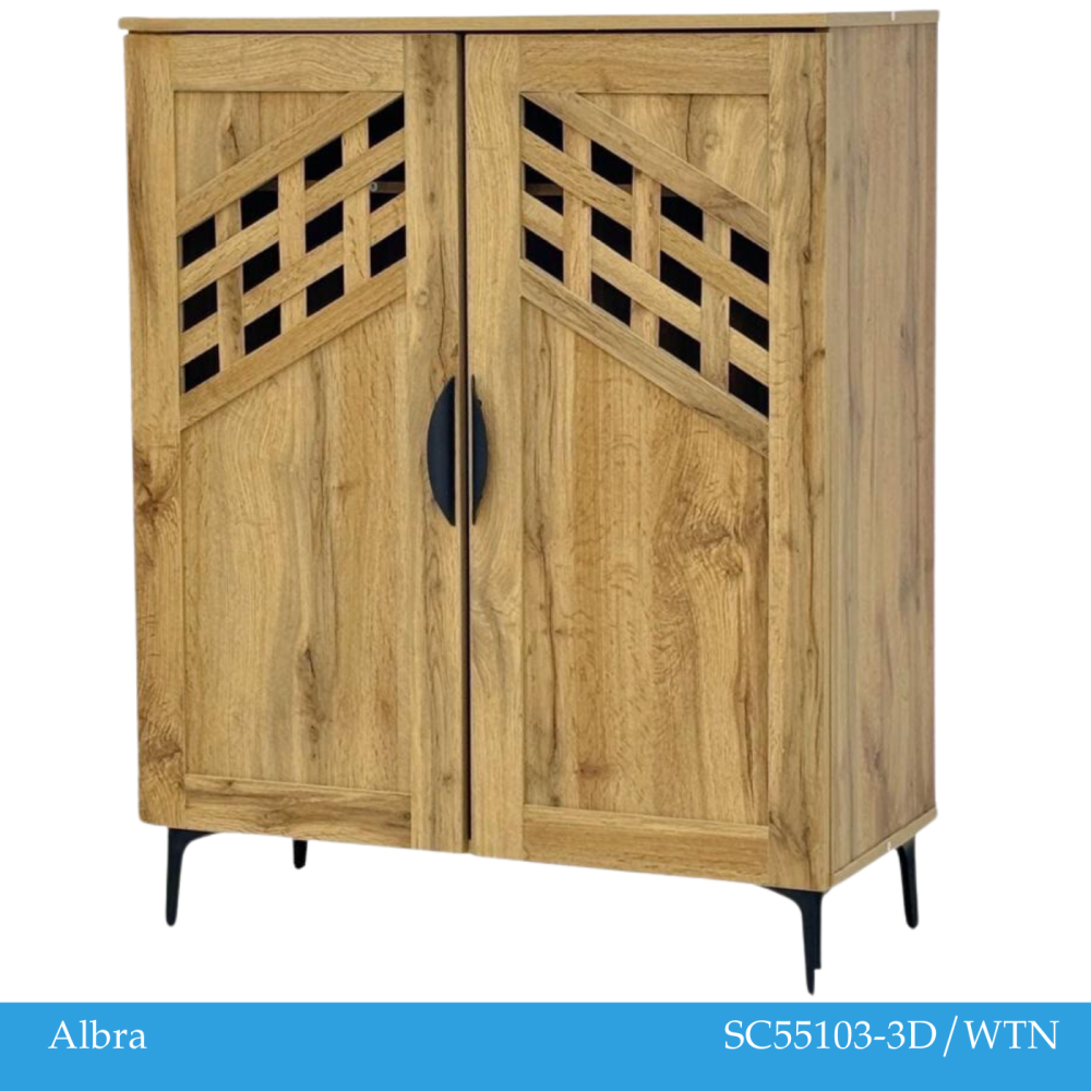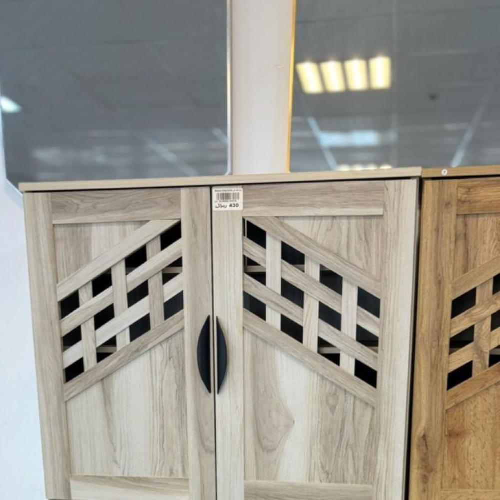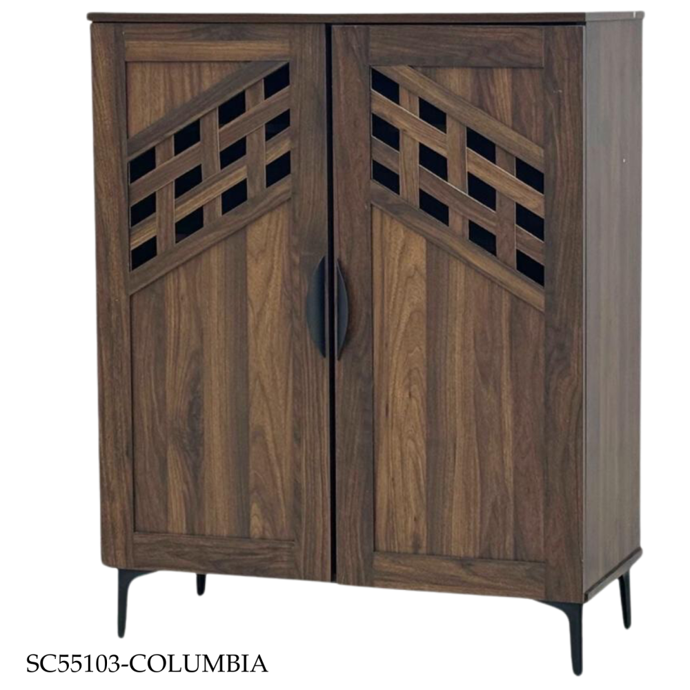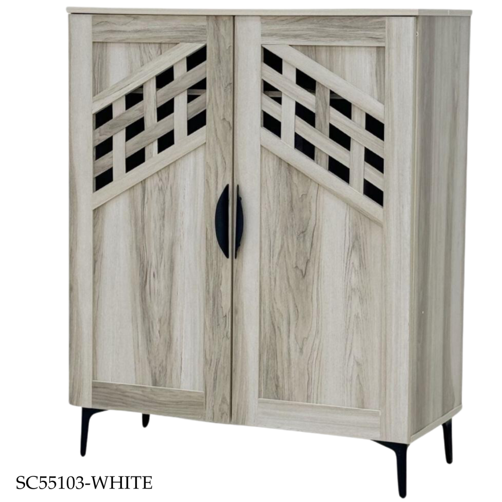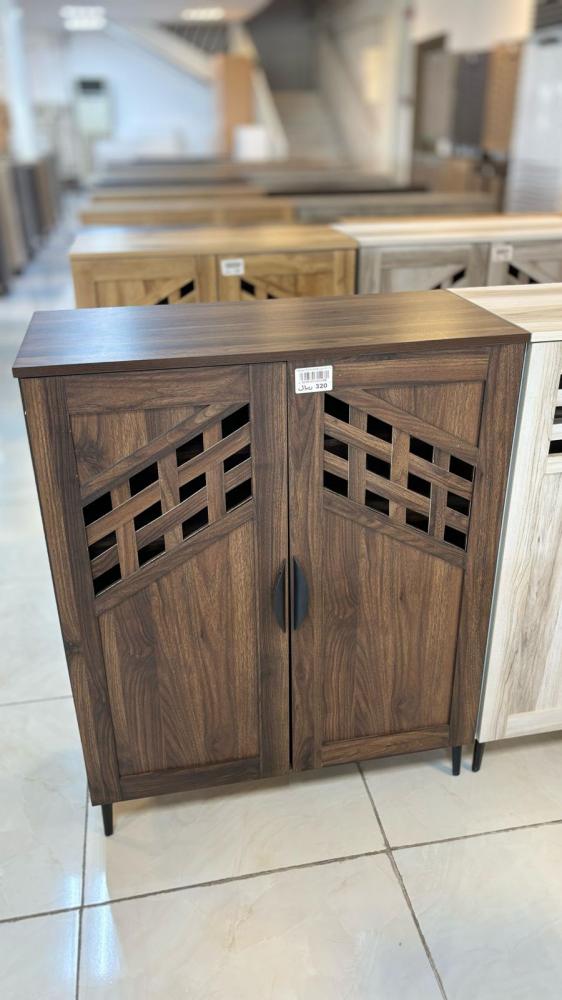A shoe cabinet made of luxurious materials and equipped with black-plated metal legs that provide stability and durability to the cabinet. It features doors decorated with perforated squares that add a touch of distinction and luxury to the design, and is equipped with internal shelves that provide ample space for placing and coordinating shoes.