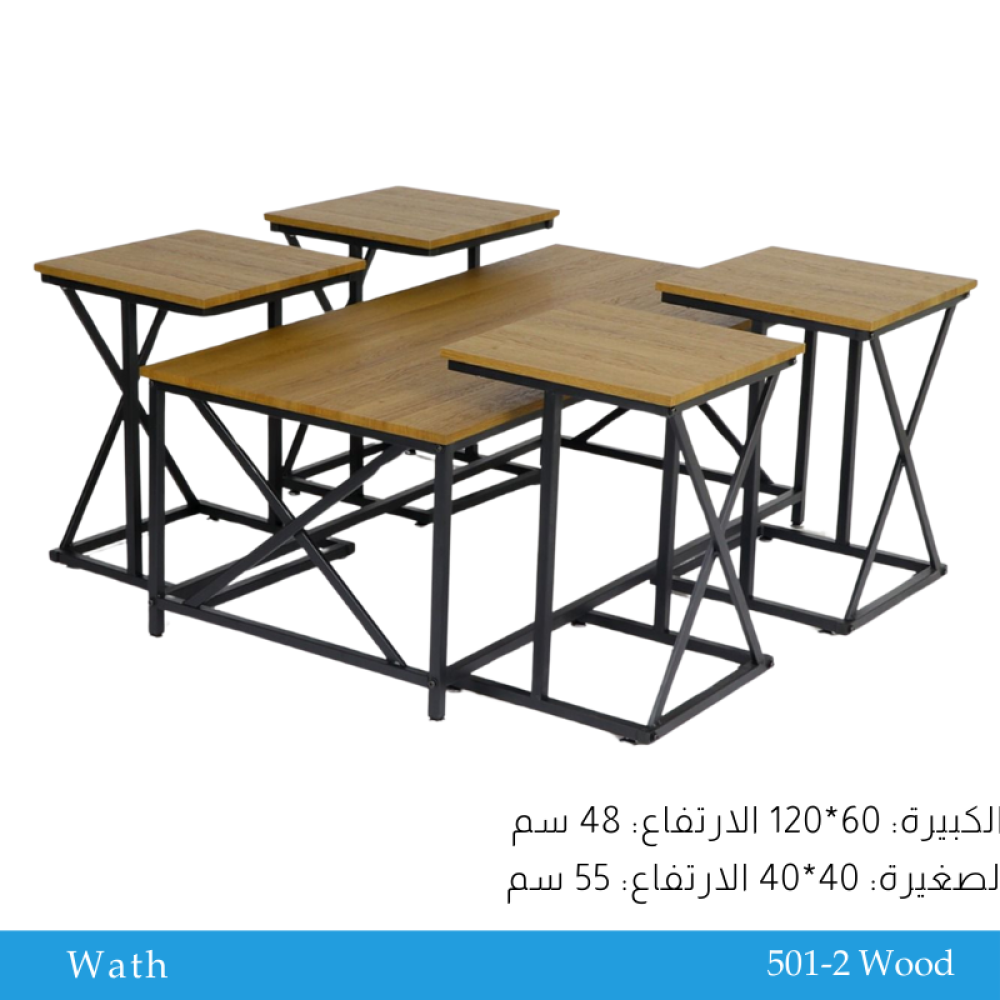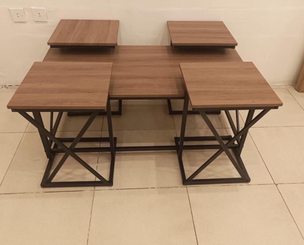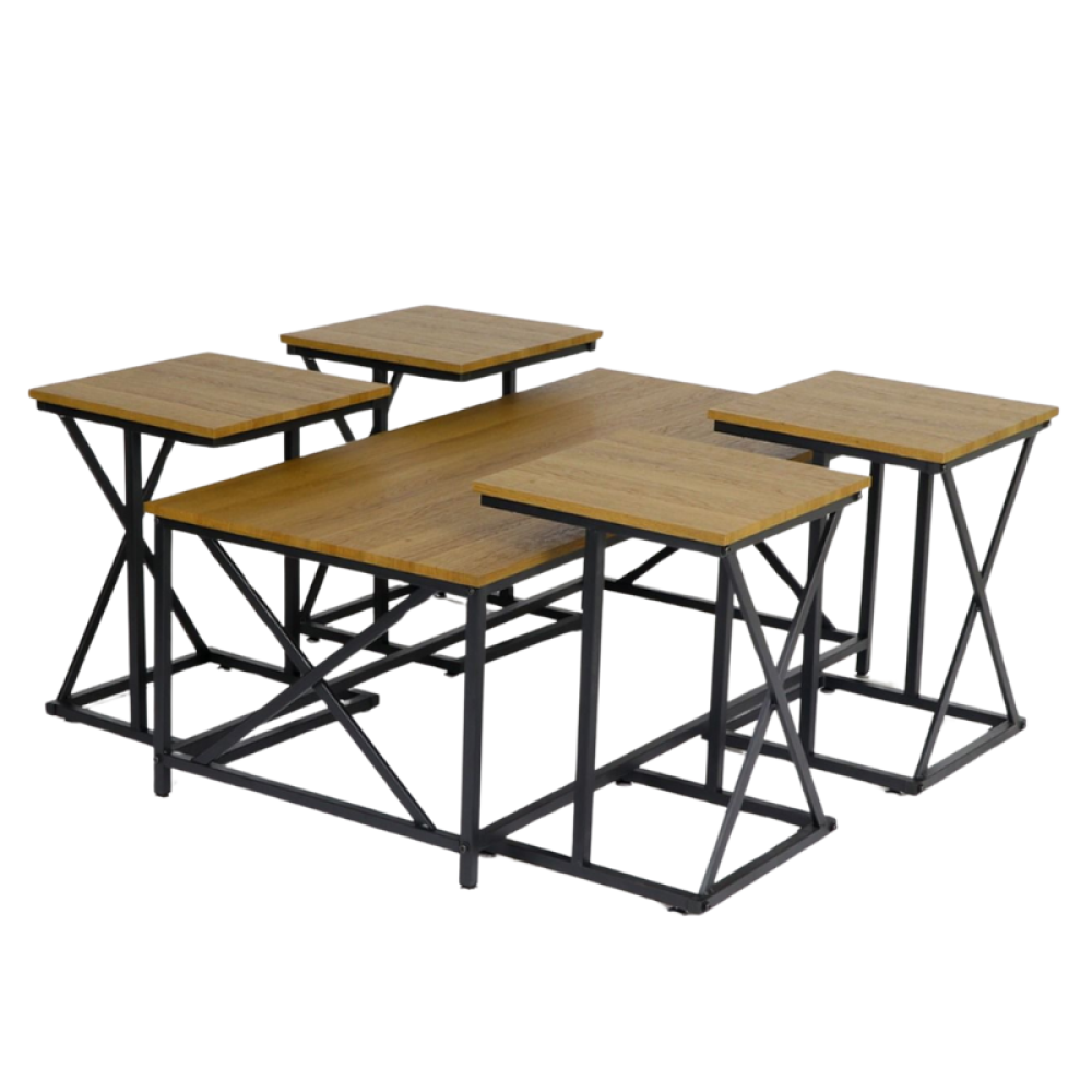 A set of five serving tables, a large rectangular center table and four side tables, all featuring a polished and smooth surface, and equipped with a durable, shatter-resistant iron metal stand in an X-shape on the ends to add a touch of distinction to the design, these tables are suitable for home decor or office work.